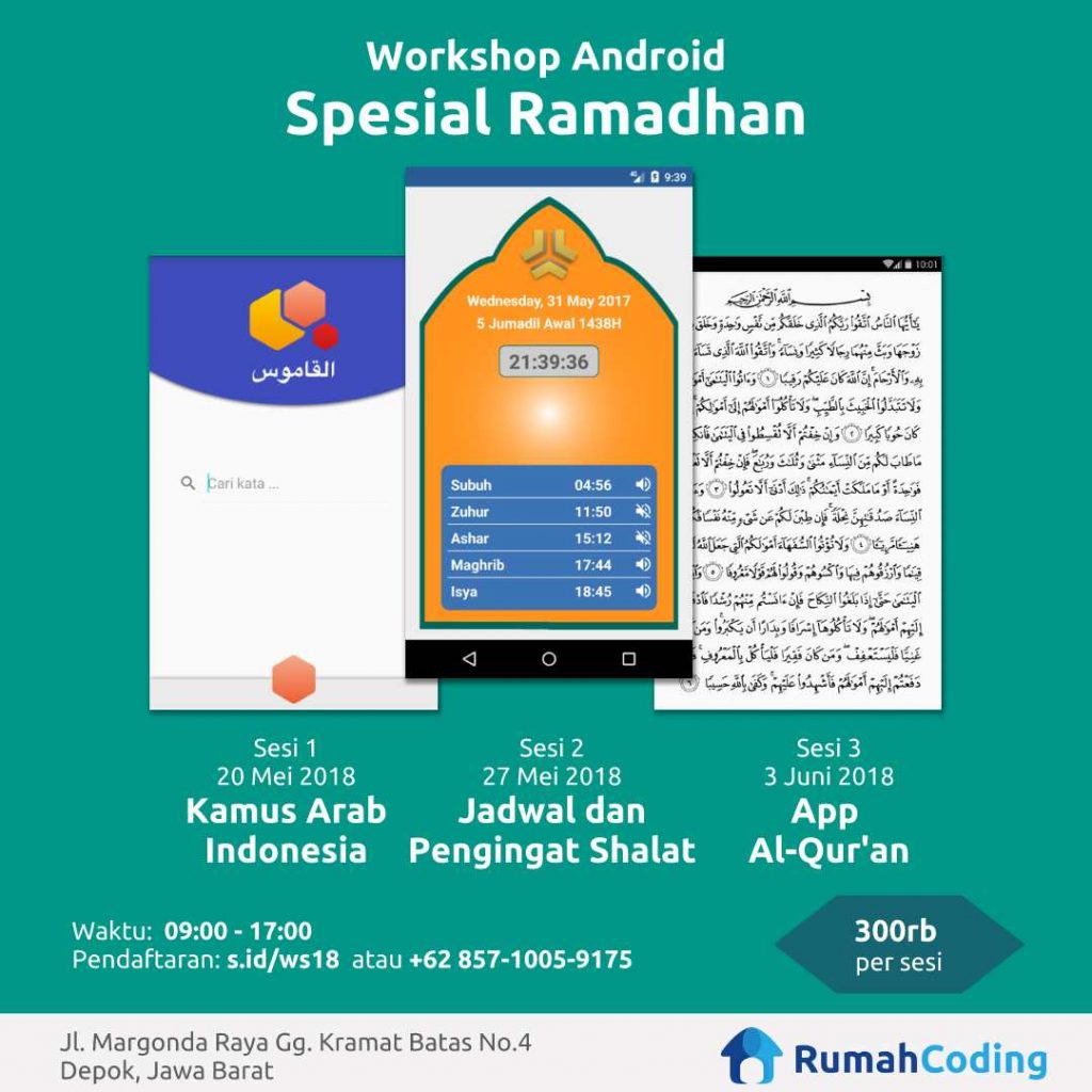 Bulan Ramadhan sebentara lagi datang, apa yang sudah anda persiapkan? Bulan Ramadhan kali ini, Rumah Coding insya Allah akan mengadakan “Workshop Android Spesial Ramadhan”. Terdapat 3 workshop di bulan ramadhan mendatang. Melalui workshop ini, anda akan langsung praktek membuat aplikasi berikut 1. Kamus Arab Indonesia Hari: Minggu, Tanggal: 20 Mei 2018 Waktu: 09:00 – 17:00 Biaya: […]